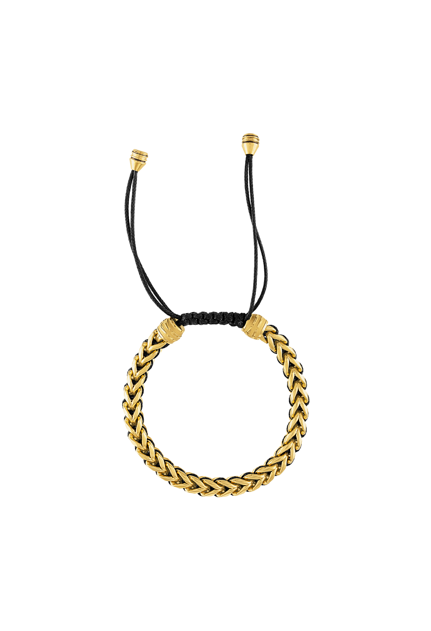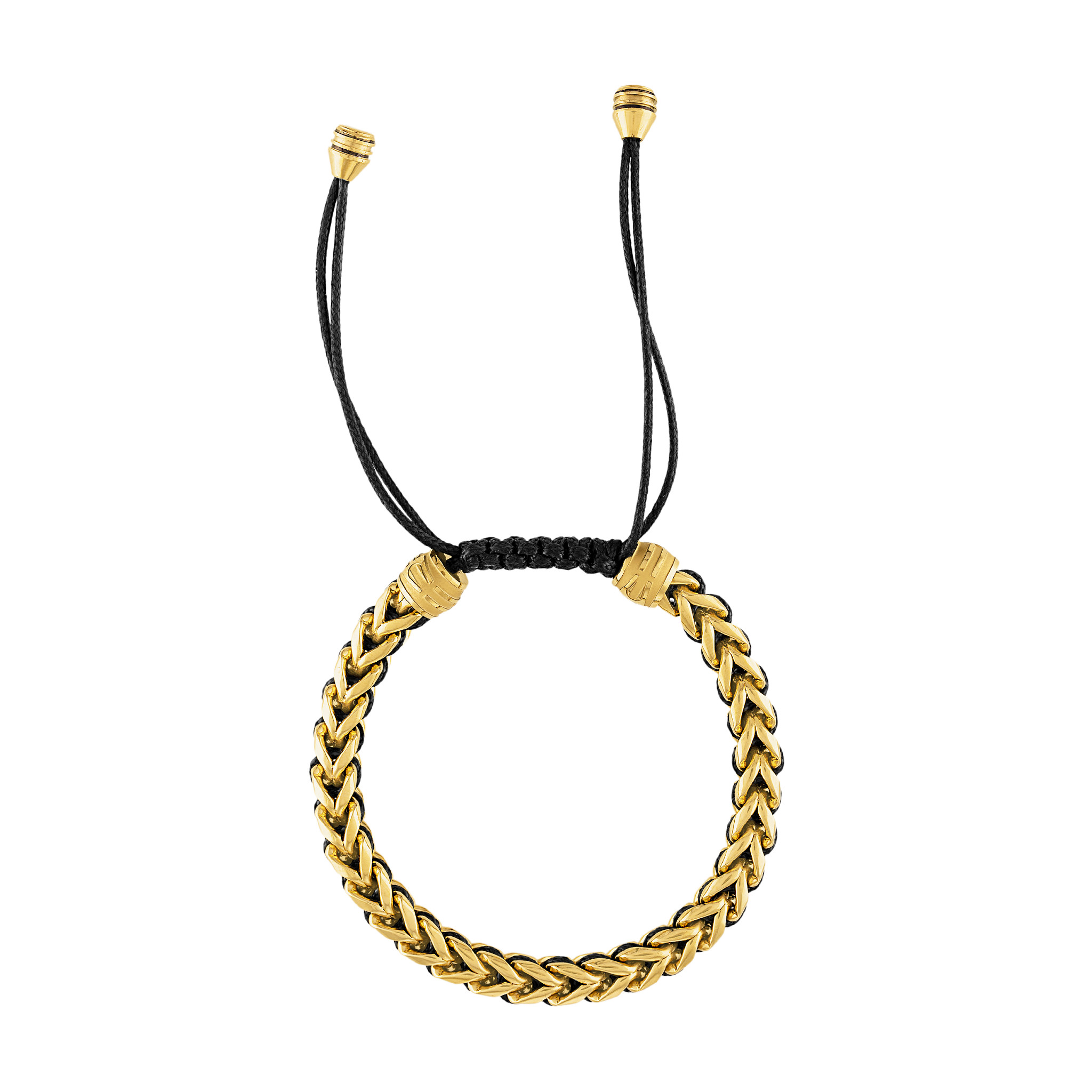 A flawless combination of classy and unconventional, this sliding bolo bracelet adjusts easily for a comfortable fit. Made of polished gold-tone stainless steel links interlaced with black cord and accented with gold-tone steel beads. End caps are etched with the Bulova signature tuning fork logo. Perfect as a stand-alone bracelet or as a layering piece.