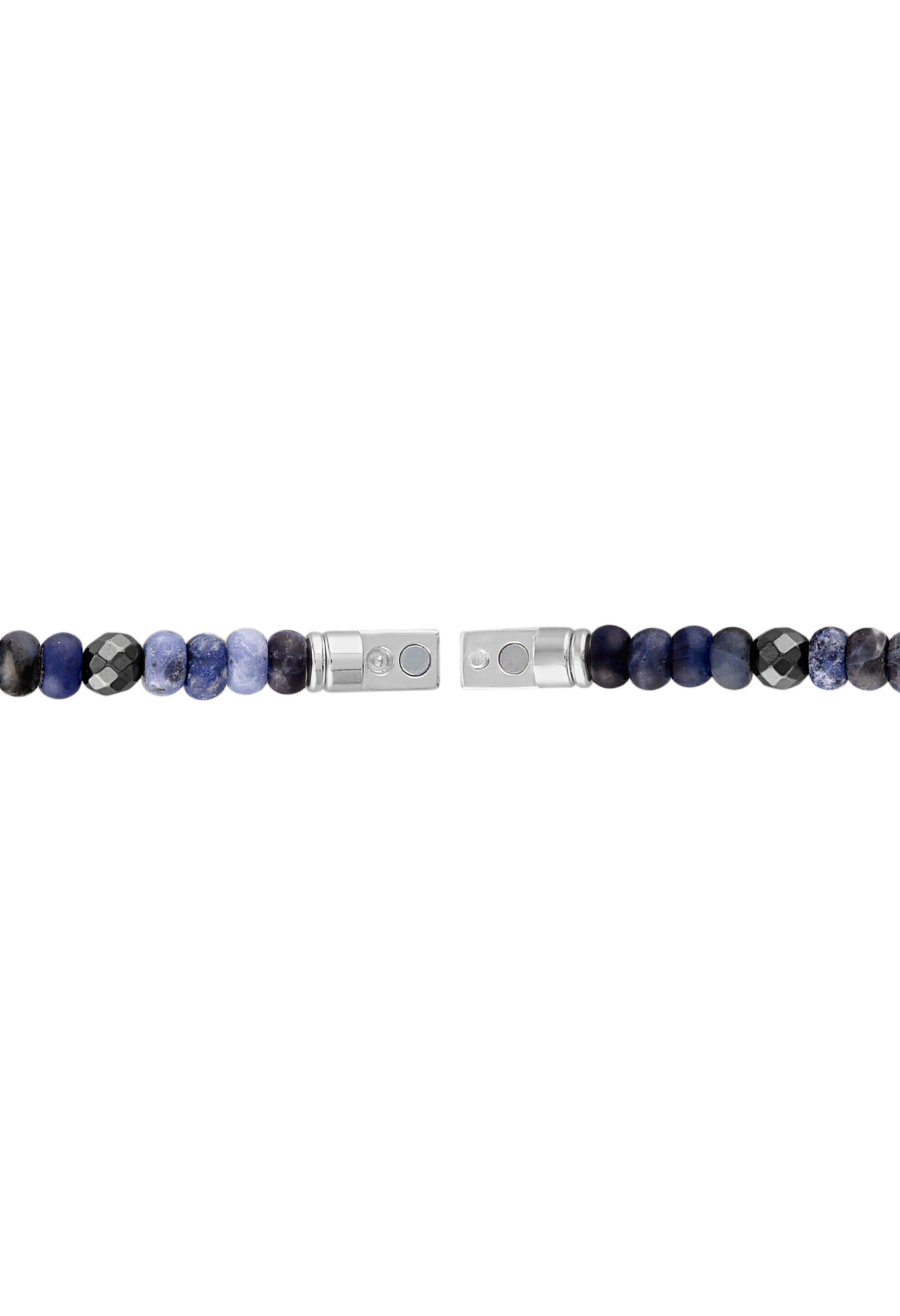 Beaded bracelet 8.5" in length made of sodalite, also known as the poet's stone, in varying shades of blue, is believed to emanate a soothing and calming energy. Accented throughout with faceted hematite beads (thought to promote stability and optimism) and crafted with a magnetic cylinder clasp in sterling silver. All of our sterling silver is rhodium plated to give the jewelry a brilliant shine and provide enhanced durability.