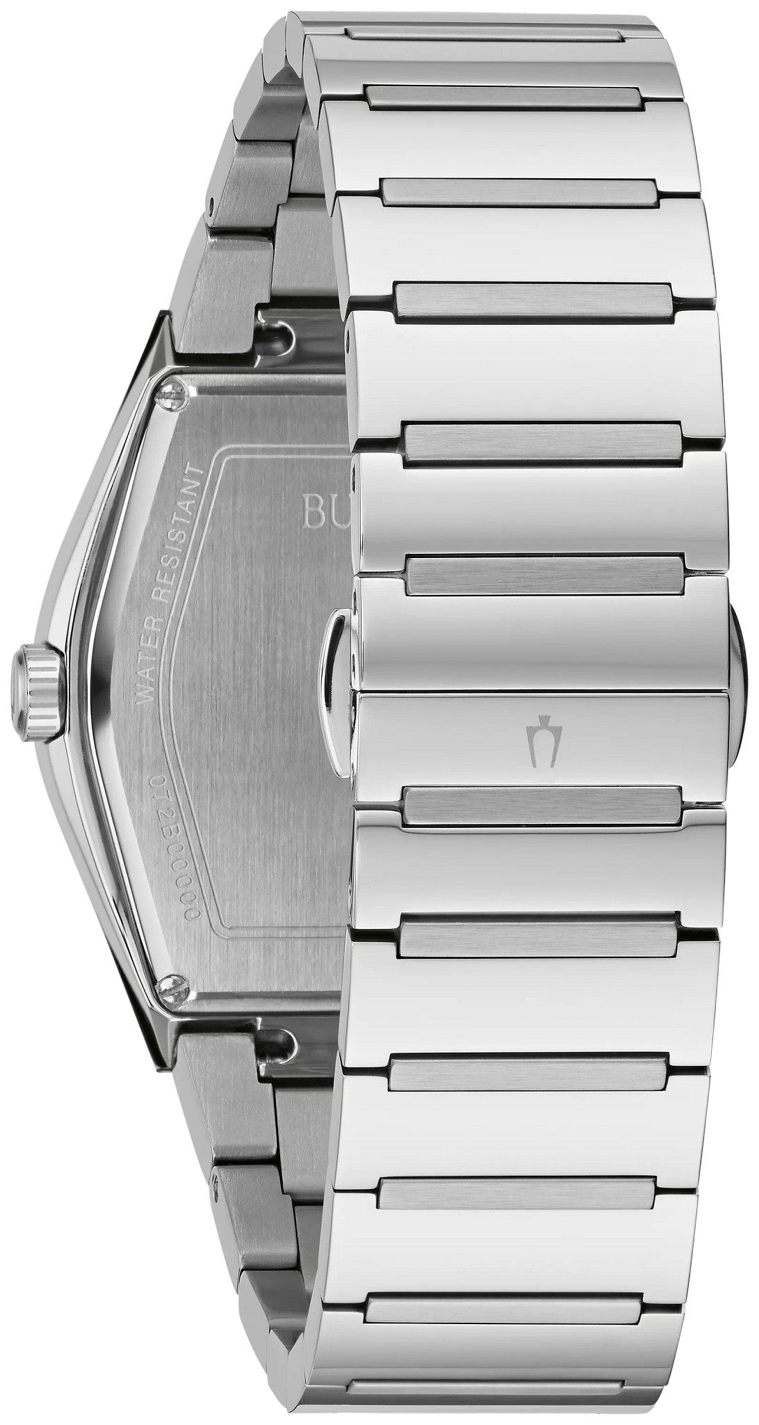 Distinctive asymmetrical tonneau shaped stainless steel case with a blue signature Futuro edge to edge curved metalized crystal features a blue dial and a stainless steel bracelet. The watch features a three-hand quartz movement, deployant buckle with pushers, and water resistance to 30 meters.